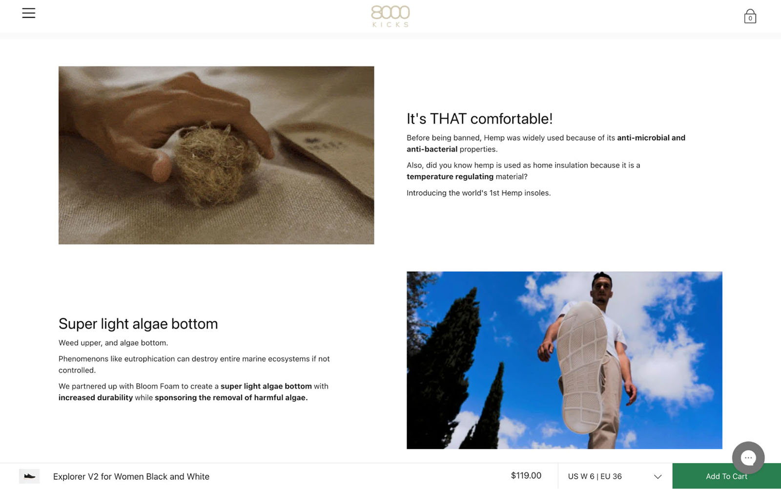 We can’t resist an emoji list. Why does it make everything feel so much more readable and engaging when there’s a colorful emoji next to it? It’s almost as if the emojis add a touch of personality and fun to the text, making it more appealing to the reader. But the real reason we selected 8000 Kicks is not just because of the emojis; they are leveraging every opportunity to include more images below the fold. They meticulously explain their choices in materials and highlight the benefits of these materials next to high-quality and engaging images. This thoughtful approach not only informs but also captivates the audience. They’re truly maximizing every opportunity to connect with their audience through visual storytelling.