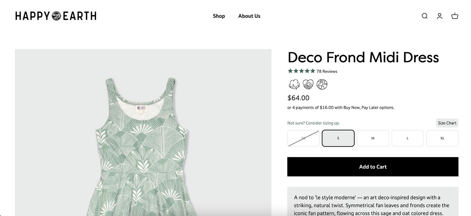 Clean, simple, and straight to the point, Happy Earth puts its sustainability practices at the very top of the product information. They make it clear from the beginning that sustainability is a core value for them. However, to not completely steal the show from the product itself, they use standard icons. When you hover over these icons, a brief explanation pops up, describing what each one means. This approach is so simple yet effective. By giving sustainability an equal footing with the product name, they communicate to their customers that they are committed to being environmentally responsible in every aspect of their business.