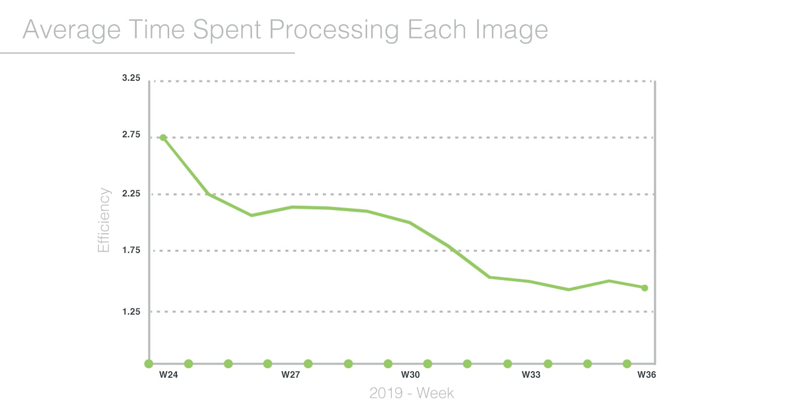 Images bypassing human retouchers means more and more images require less and less time to process at the most critical step in our assembly line potentially causing the biggest bottleneck. And the result is big improvements in production efficiency overall. You can see in the chart below a significant decrease in image-processing time as a result our AI handled more images without the help of a human retoucher.