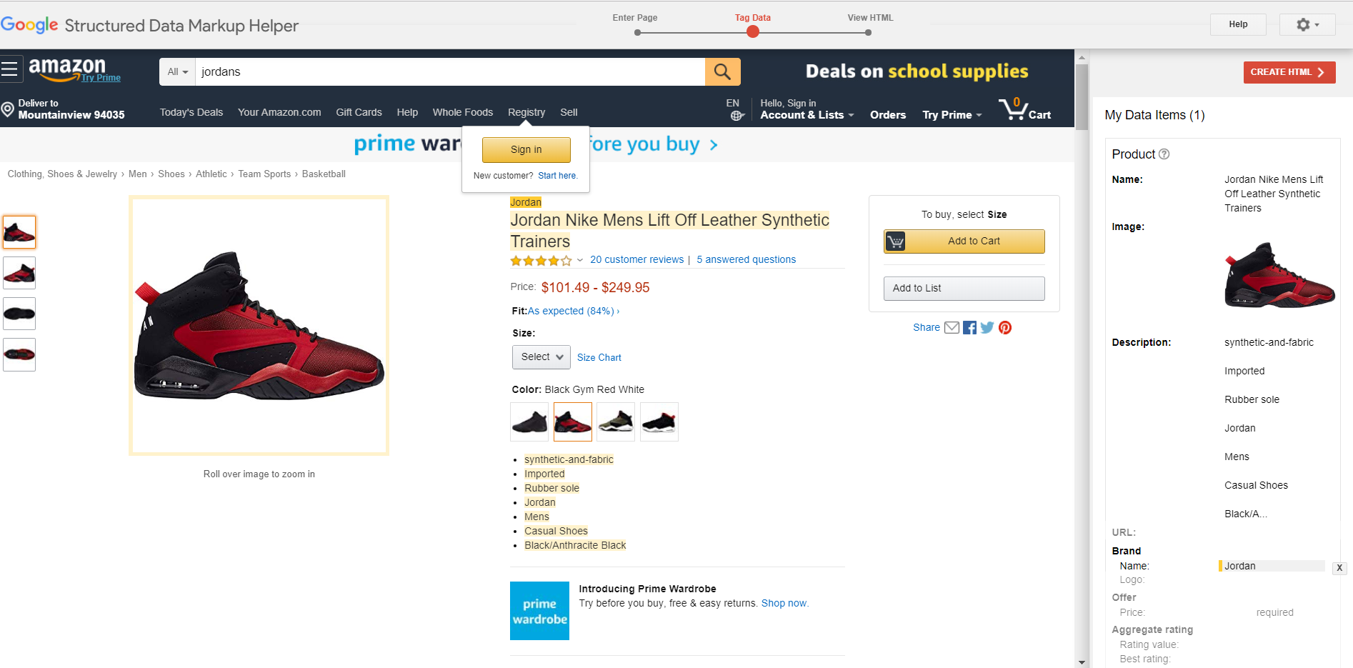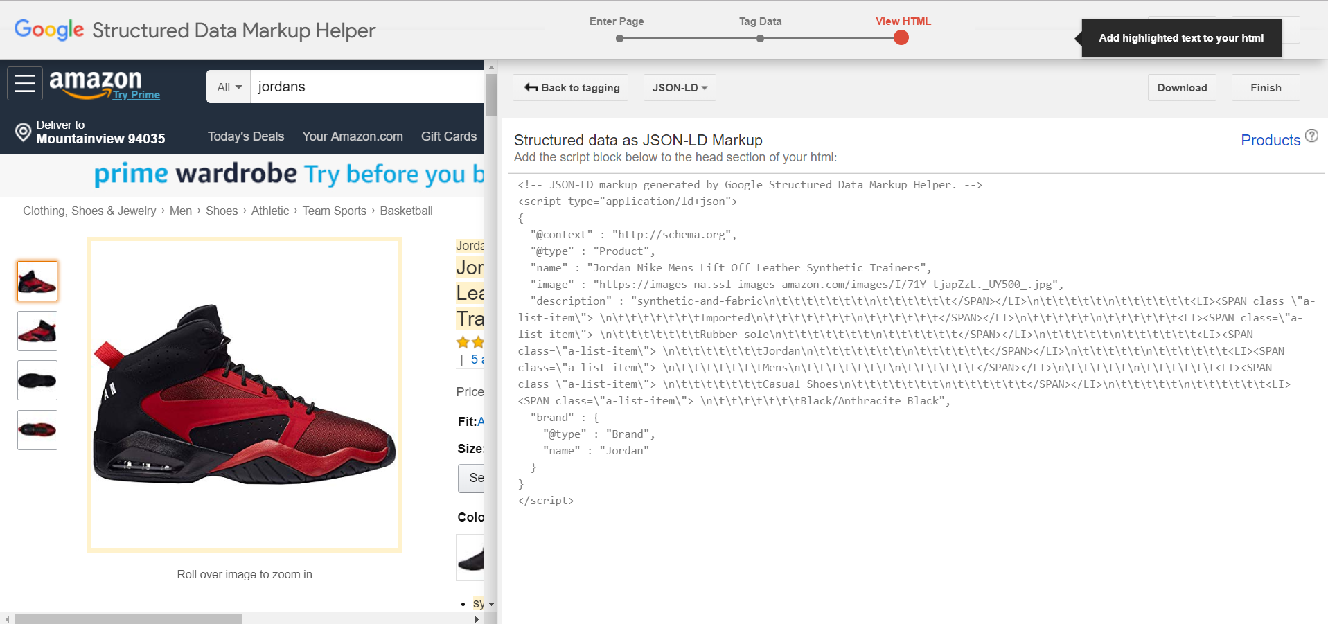 Then, Google is going to pull up my product page and ask me to identify what each piece of data is by highlighting it and selecting the data type: