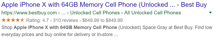 If you have searched for products on Google, you likely noticed that some results are returned in a more structured and detailed format. Below is an example of a search for “Apple iPhone X” and a subsequent result from BestBuy:
