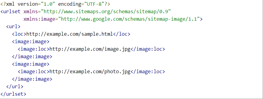 To give you an idea of what an image sitemap might look like, Google provides the following image sitemap in their documentation:
