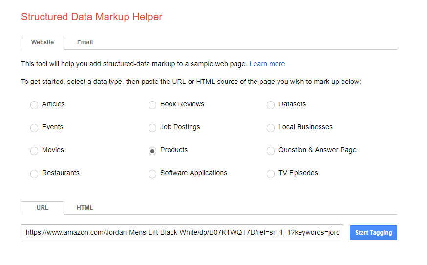 To get started, Google asks for the type of page and the URL you want to Markup
