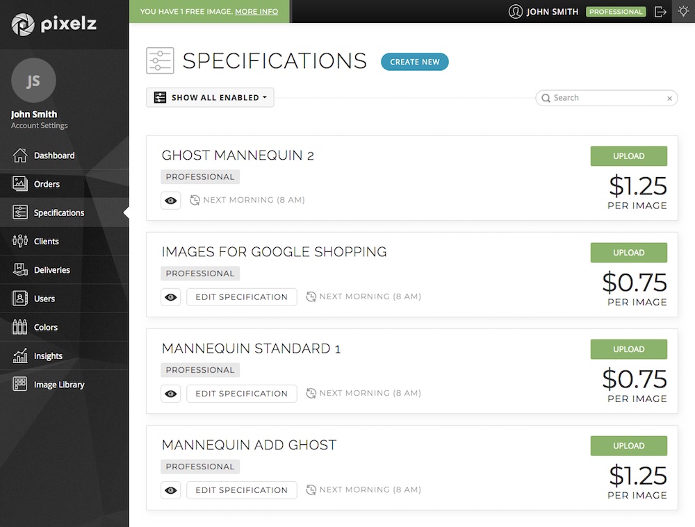 For example, at Pixelz, we have guided setup for “specifications,” which are basically style guides for how we’ll edit your images. After your specifications are setup, there’s easy order placement through online upload, FTP, or a url list in a variety of formats.