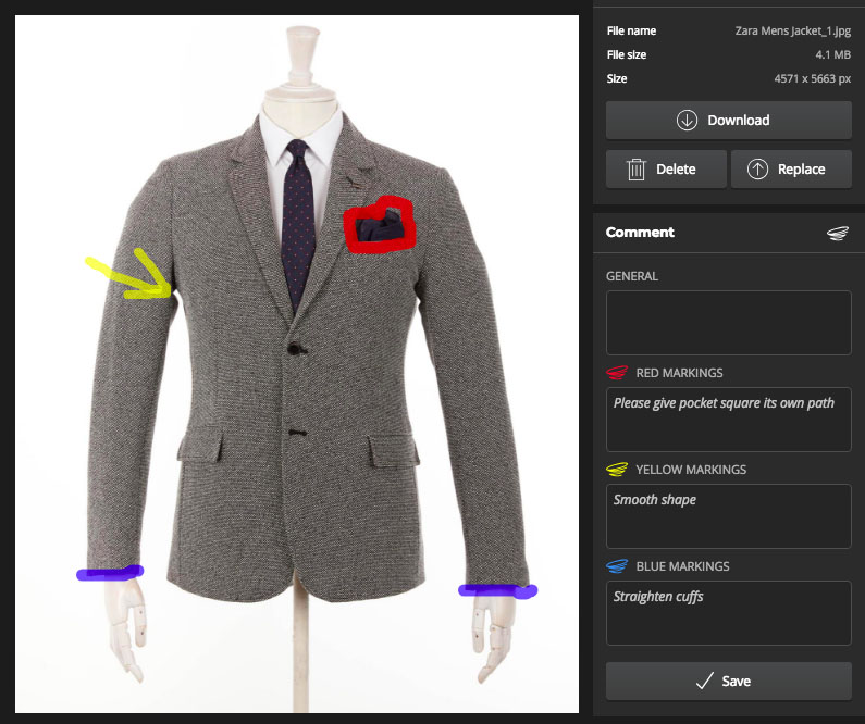 Pixelz “Markup” tool lets you streamline communication by drawing right on the image you’re submitting for editing, with color coded text boxes for additional commentary.