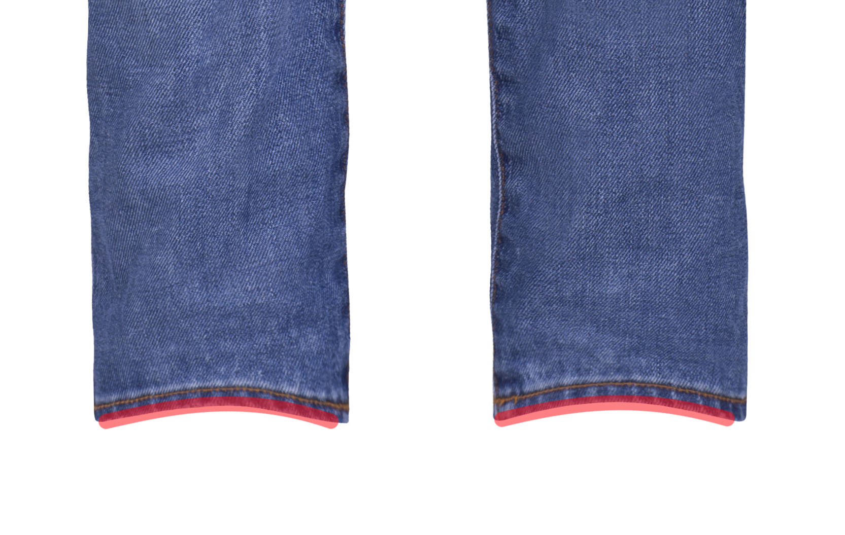 Varied lengths for both mannequins and trousers can lead to irregularities in the shape of trouser cuffs. A best practice is to select a desired shape for all pant cuffs and then retouch your product images to have a consistent look: curved in, curved out, or straight.