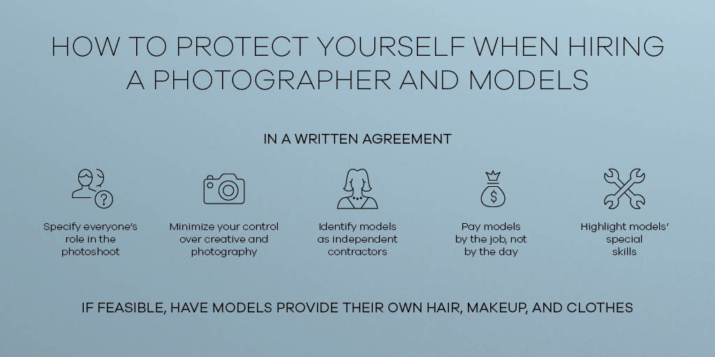 If paying the model on his/her final day of the assignment isn’t feasible for whatever reason, you’ll want to fortify your position in case you’re later threatened with a lawsuit. To protect yourself, it is usually a good idea to have a written agreement with each model, photographer and/or other entity involved in the photoshoot that clearly identifies everyone’s respective roles. Minimize your control as much as possible over the photographic/creative process in the written agreement (and in practice). Although it is highly recommendable that you consult with an attorney to prepare it, the written agreement should specify and highlight the control (or lack thereof) that you will have over the process.