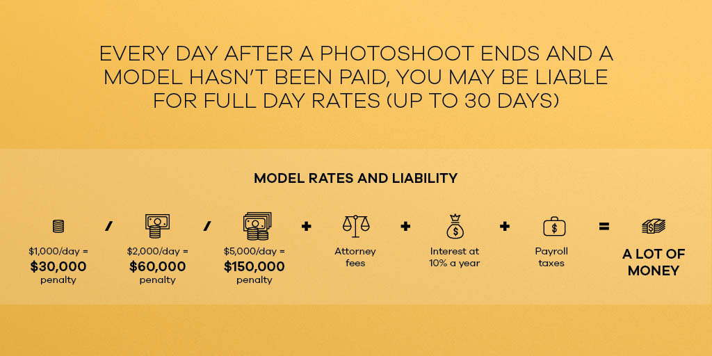 Imagine the penalties if you hired several models and paid 30 days later — which is a common practice.