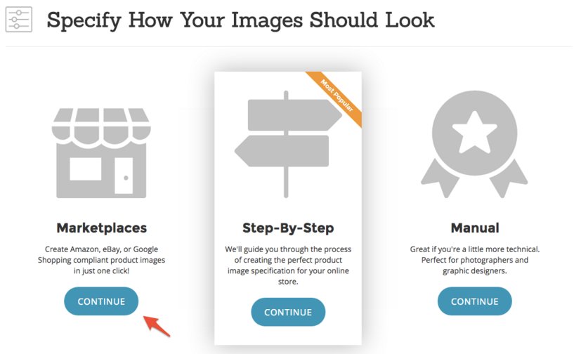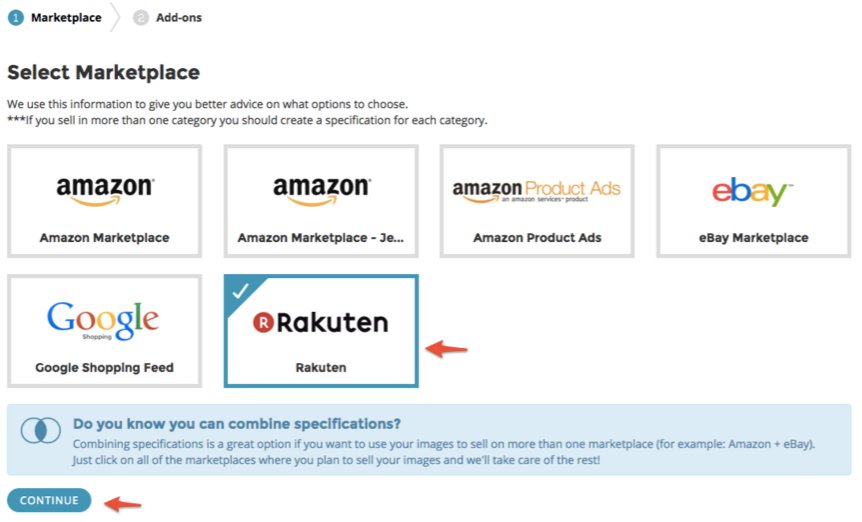 Click the “Rakuten” tile from the list of marketplaces. If you wish to sell in other marketplaces, like Amazon, eBay, or Google Shopping, you can select them too. We will ensure your product images are compliant with each marketplace’s requirements.