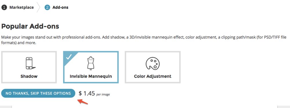 If you would like to add a higher level of professionalism to your product images, you can select add-ons. Shadows, the invisible mannequin effect, and color adjustment can all elevate the quality of your images.