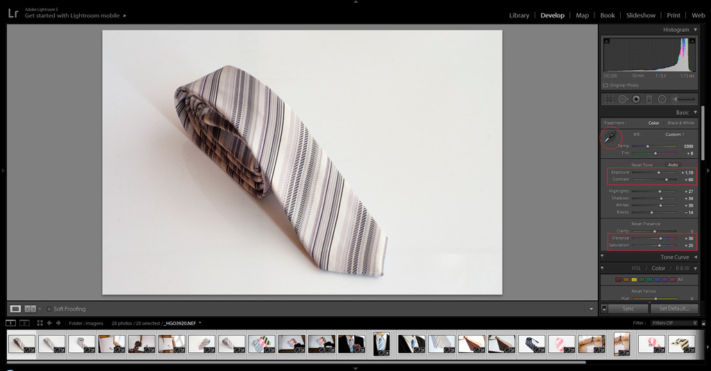 The main adjustments you should expect to make are: white balance, exposure compensation, contrast, hue/saturation, and sharpness, in addition to image resizing, cropping, and file format conversion. To show accurate colors in your product images is very important. Nothing will annoy a customer more than receiving an orange tie when the product looked red on your website, so take into consideration to make the proper adjustments to avoid this. We recommend to use greycard / colorcheckers and let a post-production software to determine that the color is spot-on.