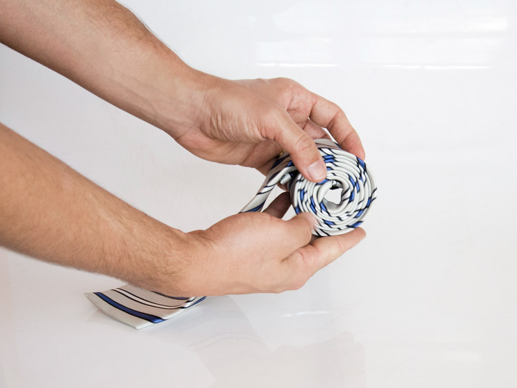 Another good way to position the tie is to roll it into a compact pack, as shown below. Once most of the tie has been rolled, you can extend the front of the tie straight out or at a 45º angle. If you can’t get the tie to sit the way you want, use a prop to keep it still. Below, we are using a bottle to position the tie roll the way that we want it. Just remember to hide your prop underneath or behind the tie.