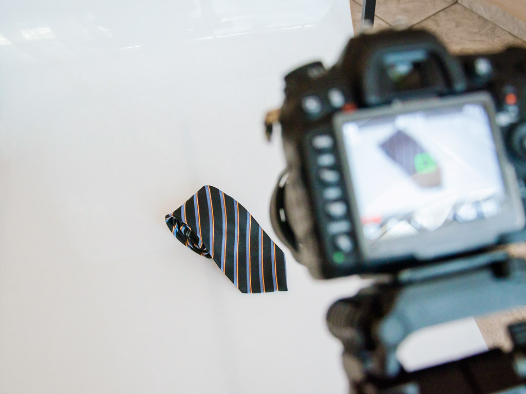 Although men ties rarely become wrinkled or creased, it can certainly happen, so it is important that you dedicate time to examine and prepare each tie before you photograph it. Transport and storage are the two most common culprits of creases and wrinkles, so be sure to have an iron handy if your tie has been folded or packaged for a good amount of time. You might also discover that the tie you are supposed to photograph is an unfinished sample or has been damaged in some way!