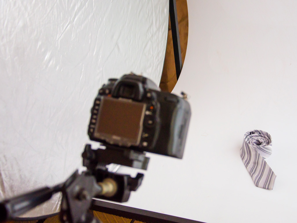 We tried to keep the lighting setup as simple as possible in this post, so we opted to shoot in natural window light rather than use artificial studio lights. If you feel comfortable working with strobes, the principles for properly lighting your product will remain the same. In the setup above, we have two light sources. The primary light source is natural sunlight, which is being “diffused,” or softened, by the sheer fabric that we have affixed to the window pane. The secondary light source is the reflector panel that we have positioned to the right of the product; this panel is reflecting stray window light back onto the tie.