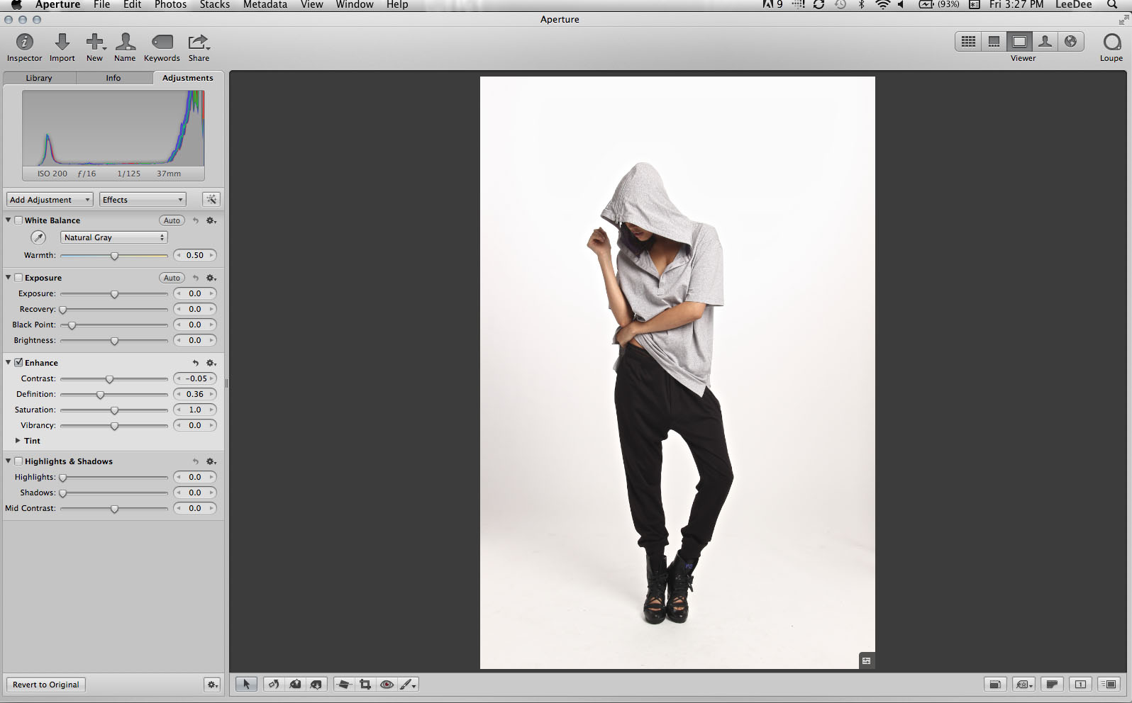 Example of using Aperture to do basic contrast and color temperature adjustments.
