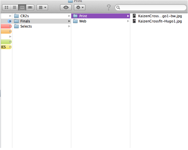 You should also label accordingly by including version information in the actual file name. For example, the original files in the image above are CR2 or “RAW” files. The images in the folder titled “Selects” are the images that were chosen for editing from the original CR2 files. Each image in the folder titled “Finals” has a large, printable version and a smaller web-ready version saved there; the larger versions are named ProductName_CompanyName_Color-print.jpg and the smaller versions are named ProductName_CompanyName_Color-web.jpg.