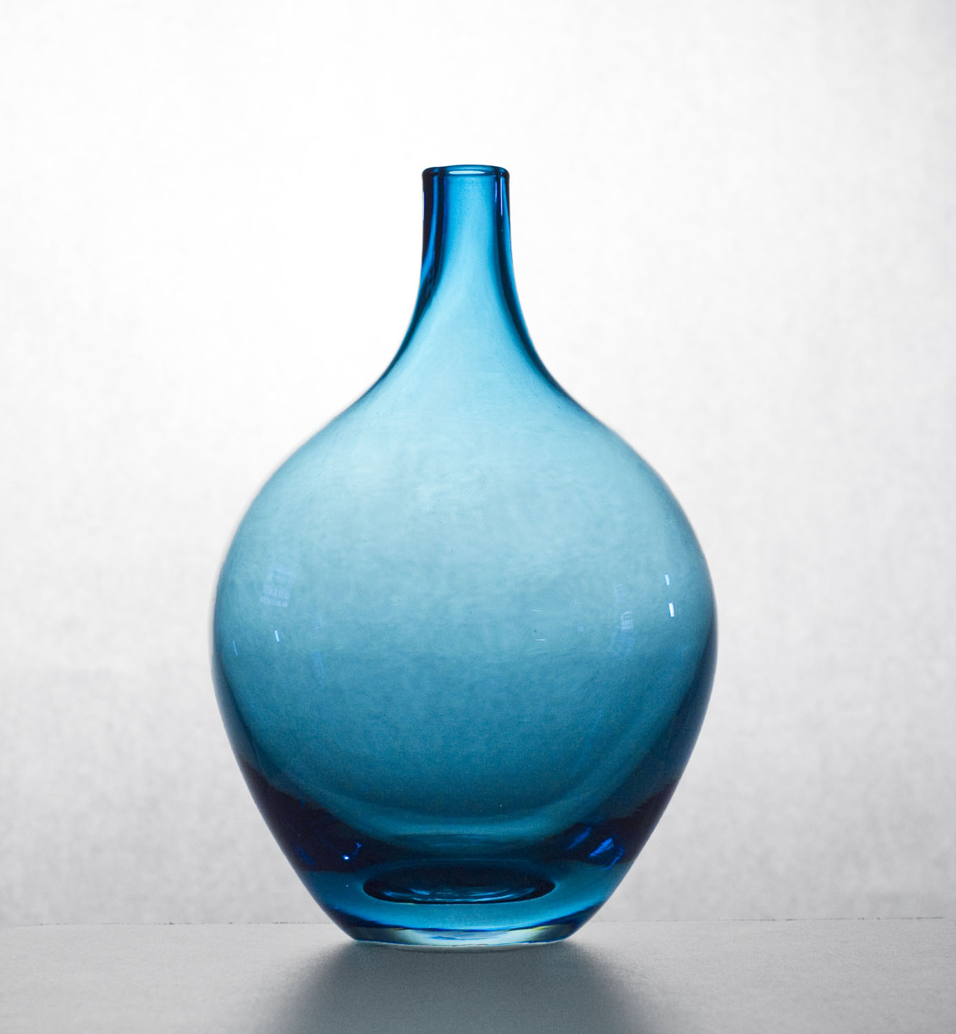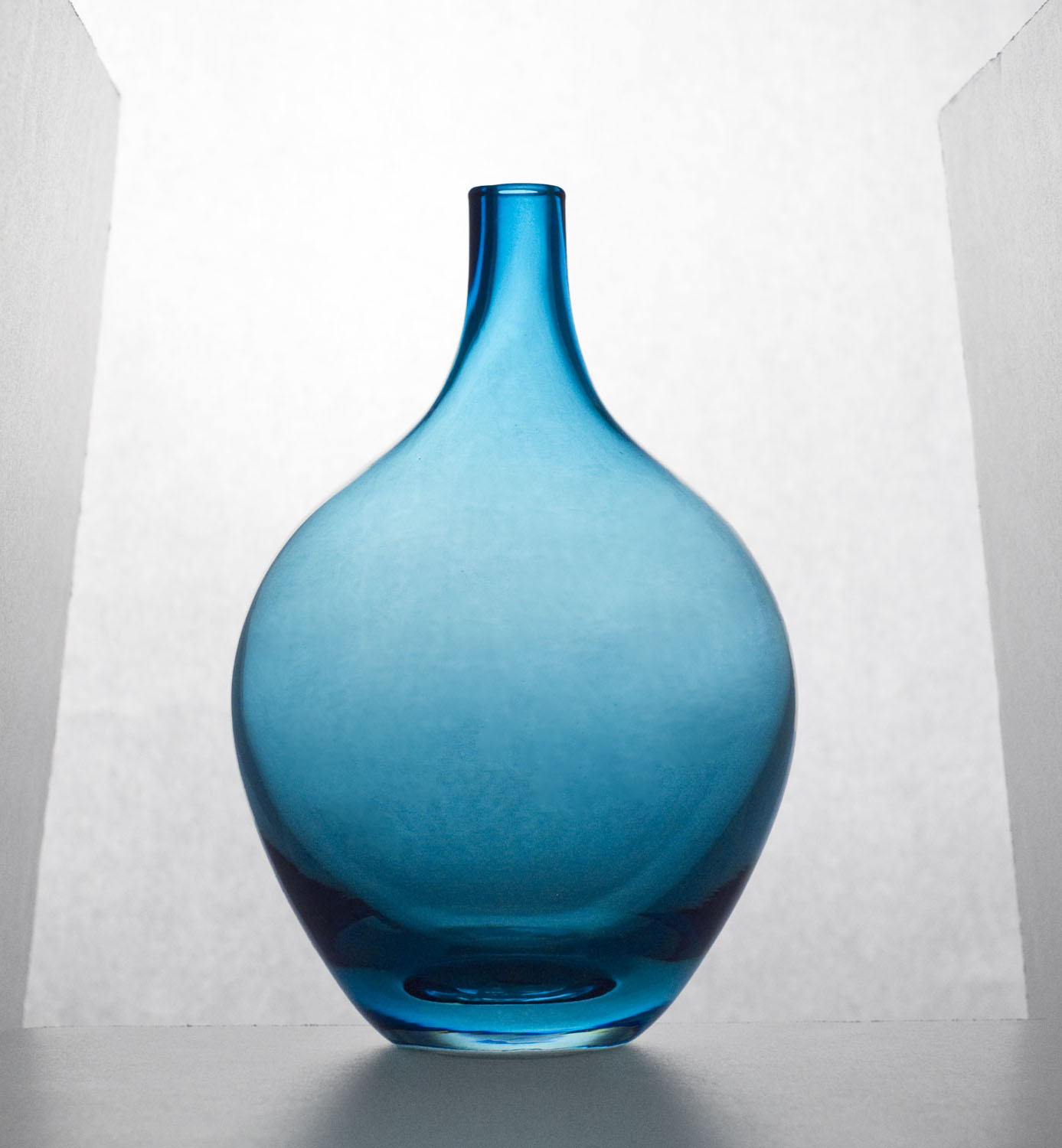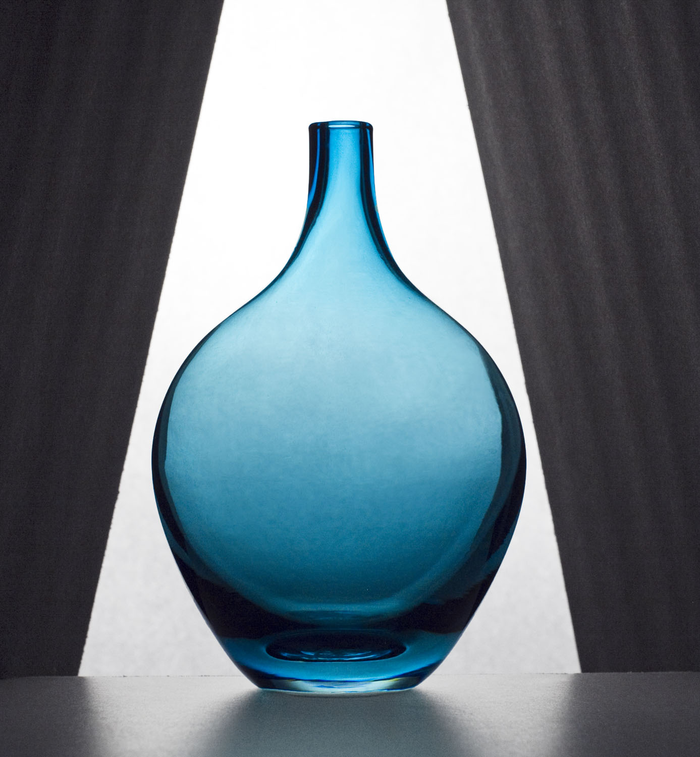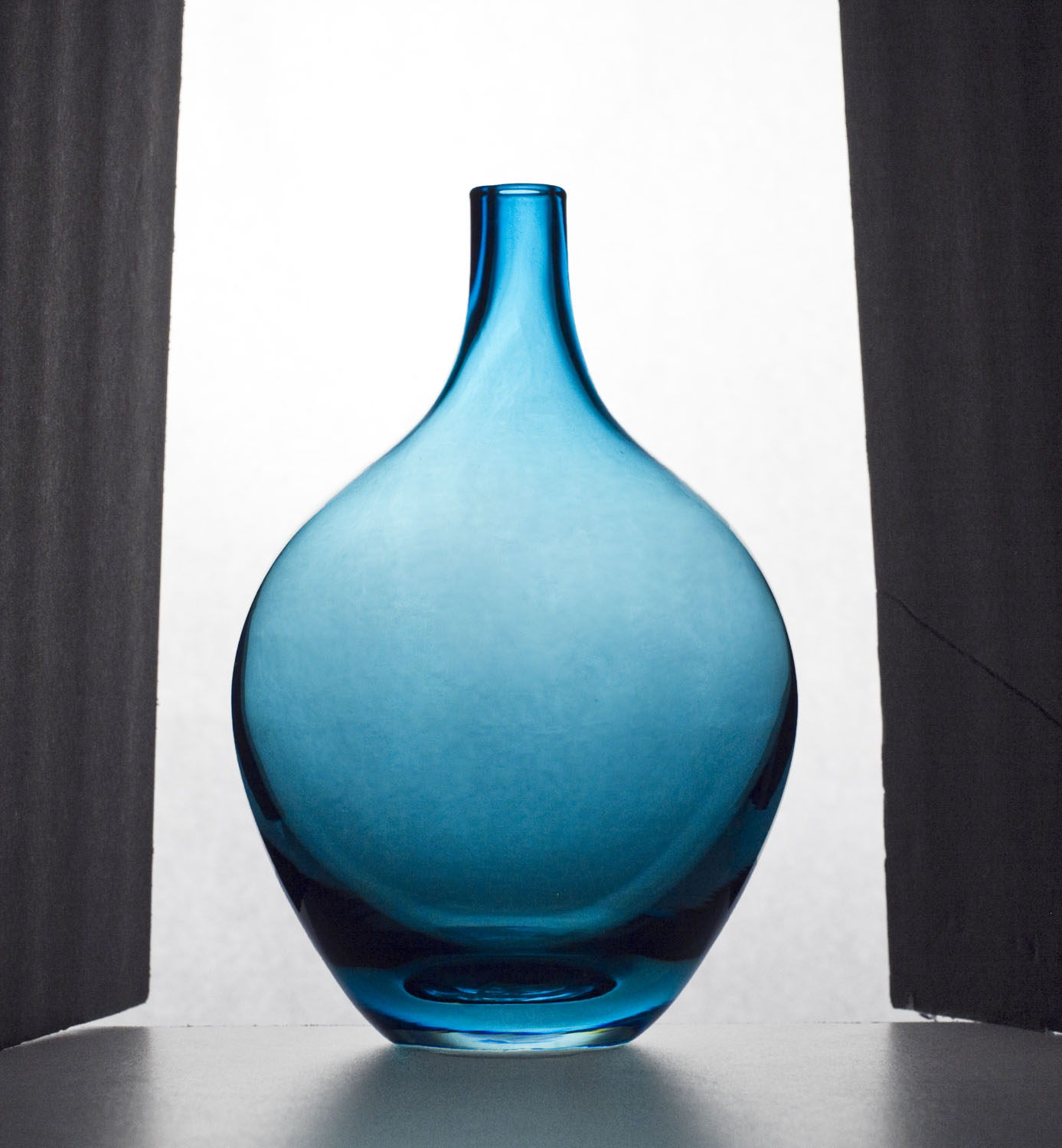 For bolder outlines and colors, try using black foam boards to either side of your product. This will better saturate your colors and emphasize the edges of your glassware. In the image series below, you can see the differences between using no foam boards on the sides, using white boards, using black boards, and using black boards pulled in tightly next to the product. Most notably, you will notice that the outer black line of the vase gradually becomes more defined as foam boards are added, darkened, and moved in closer.