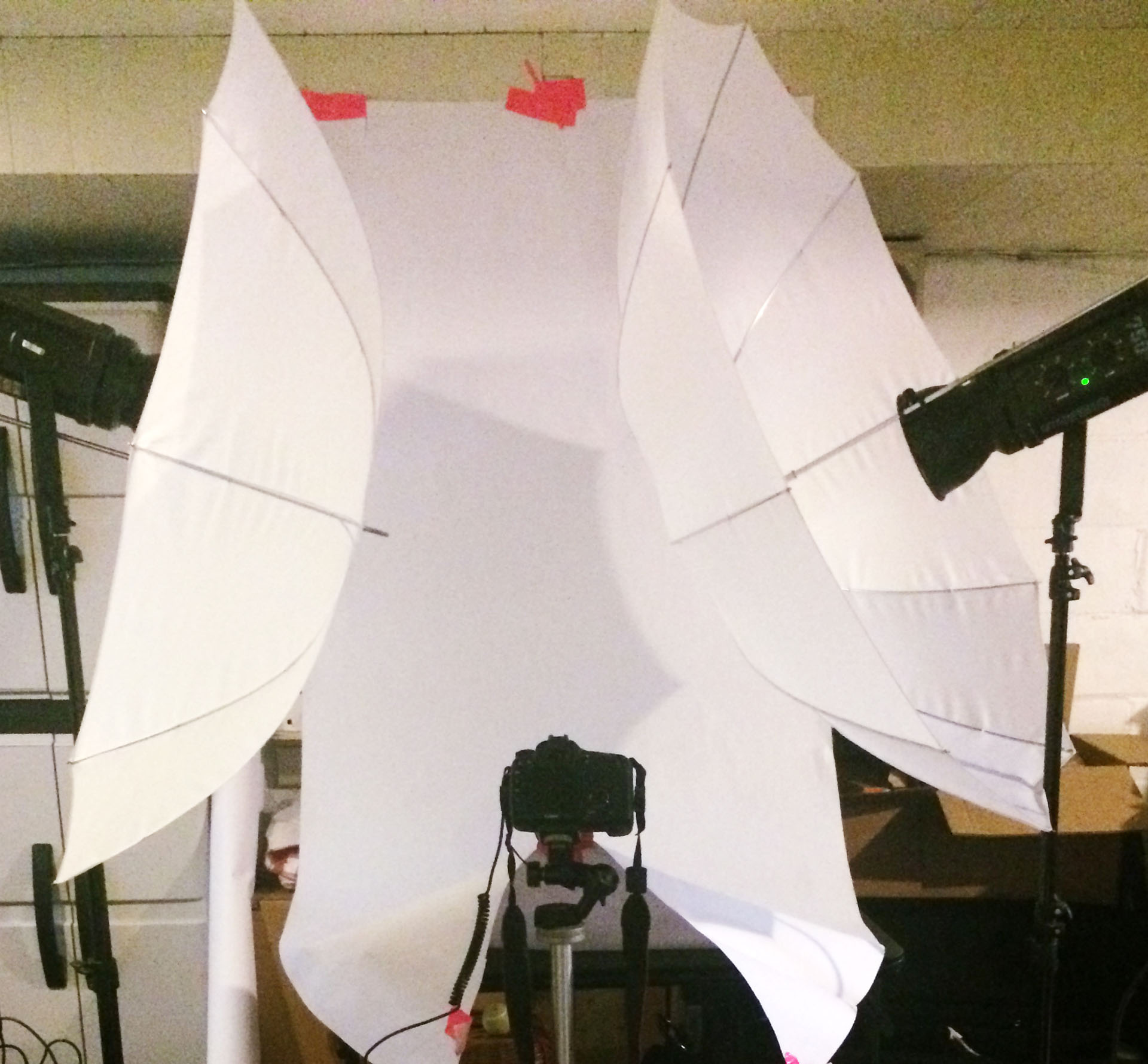 Next, you need to diffuse, or soften, the light source with an umbrella and/or several layers of rolled paper or thin white fabric. Position the white paper or fabric between the product and the light and supplement that by placing white foam board under the product and to both sides, as shown above.
