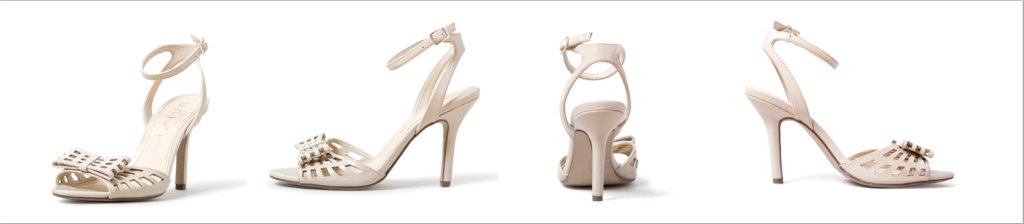 Nothing is more unflattering than a limp, lifeless pair of shoes. The image of the heels on the left, provides very little accurate information to the customer to help inform their purchase decision and it certainly doesn’t make the shoes seem appealing. Instead of a creamy white, the shoes appear to have a yellow tint, and although the shoes have been arranged to show different angles of view, customers will have difficulty imagining how the shoes actually look when worn.