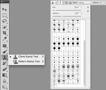 Go up into your brush selections and choose a softer feathered one, and you can adjust the size of the brush as you go. I like to make this brush opaque quite a bit, because as I work I’d like to have a lot of control over the changes it makes. Zoom in on your tiny spots that you’d like to correct and “Option/Click” the area you would like your scuffs to look more like.