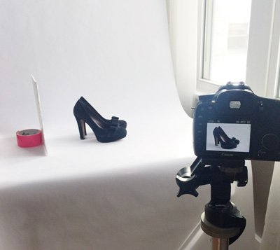 In my case, I have a great large light source, but I am photographing a black suede pump and generally black products need an extra fill to see texture and detail (because it's darker). To do so, I cut a small piece from my foam core board and propped it up vertically using a roll of duct tape. You can get creative with what you use for the prop. The important things are that your foam board stands straight, is positioned opposite to the window, and is the same size as your subject or larger. When set up, the light coming through the window will bounce off the bright white board and "fill" the shadows on the left (darker) side of the shoe. As you can see in my images above, the bounced light fills in the back and side of the shoe nicely allowing for detail to be present.