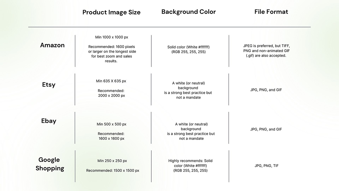 Marketplace Product image requirements for Amazon, eBay, Google Shopping, and Etsy.