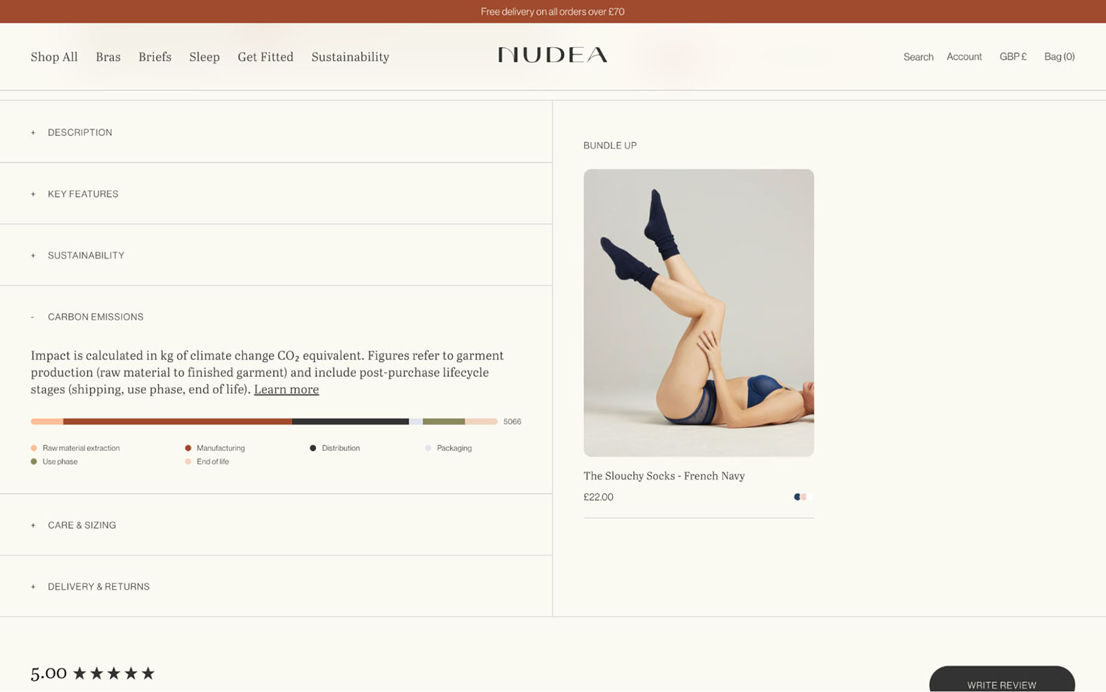 If you haven’t caught on to the trend, we love it when brands make it easy to understand everything about the product. The more images, emojis, and graphics, the better! In the case of Nudea, they excel in transparency by displaying the carbon emissions of a product in a handy little graph. This visual representation makes it effortless for consumers to grasp the environmental impact of their purchase. And giving the graphic its own section ensures that this information doesn’t get lost amongst other text. Nudea's approach to incorporating clear and engaging visuals aligns perfectly with its commitment to sustainability.