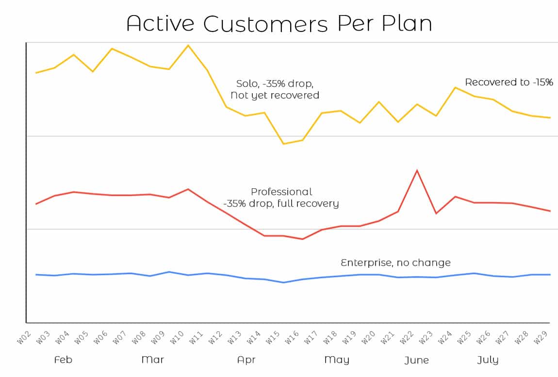 Below we look at active customer count by plan type to see who suffered the most dramatic event of all: going to zero.