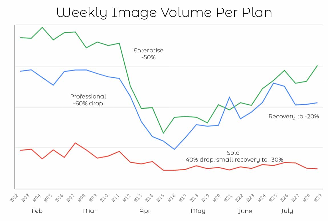 The smallest businesses seem the most at-risk of an incomplete recovery. On a percentage basis, more Solo clients were lost than any other tier, fewer came back, and their image volume has seen the least recovery.