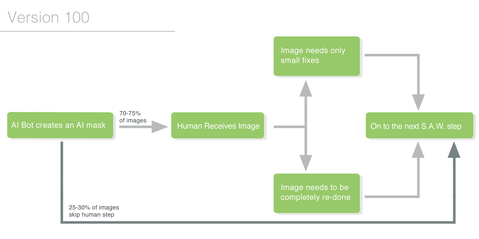 In previous versions of our AI technology, every image was first edited by an AI bot and then sent to a human retoucher. If the AI did a good job making the layer mask, the human retoucher would only need to spend a few seconds making small corrections before sending the image to the next step in S.A.W.™. For images that were too hard for the AI, a human retoucher would need to delete the AI’s work completely and start the image over again (resulting in no efficiency gains on the image).
