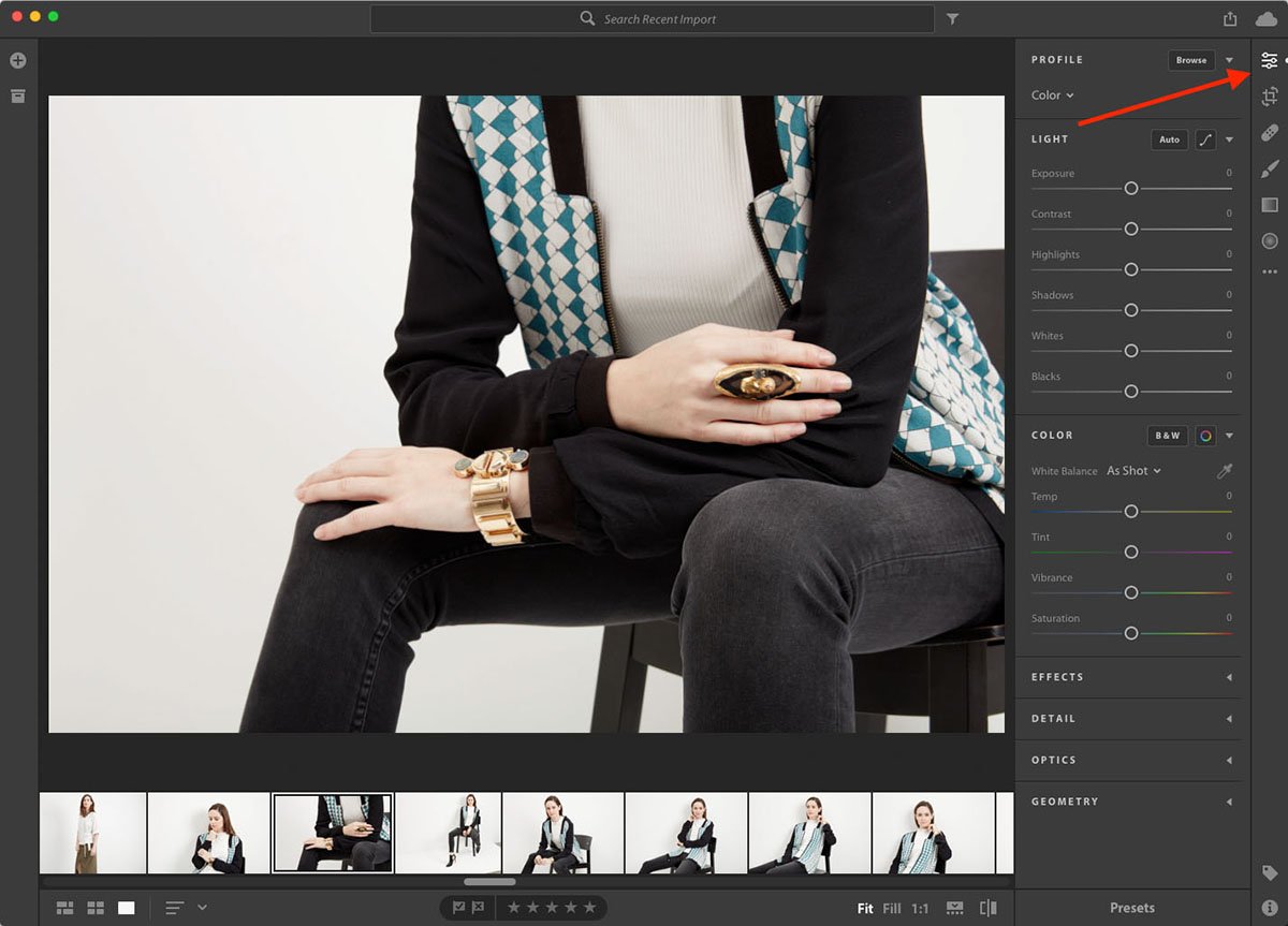 We want to edit our photo, so click the "Edit" icon; it's the top-right icon that looks like filter sliders. This will expand a panel on the right side with several options: "Profile," "Light," "Color," "Effects," "Detail," "Optics," and "Geometry." Each of those is a toolbox we can use to make edits. Expand the "Light" and "Color" toolboxes, if they're not already open.