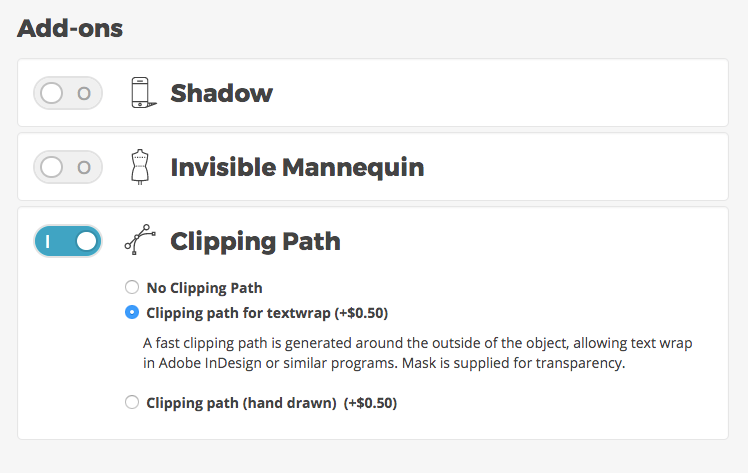 For example, if an image contains a product, a model, and their combined shadow, you need to define which (or all) of the three should be outlined by the clipping path. And you need the flexibility for that to change per order and per image, without requiring an extensive back and forth with a time-shifted account rep.