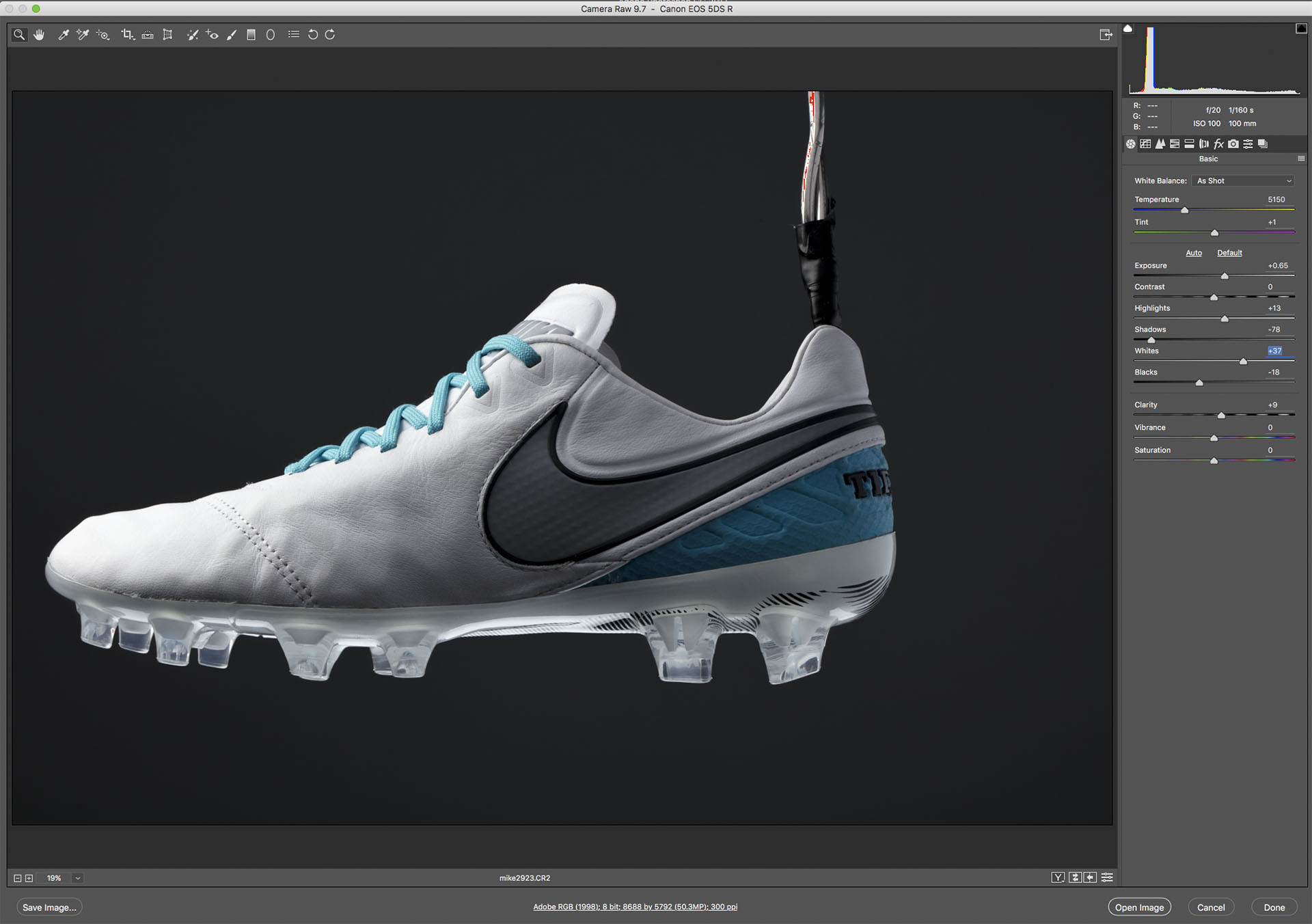 Cleat with initial adjustments in Adobe Camera Raw.