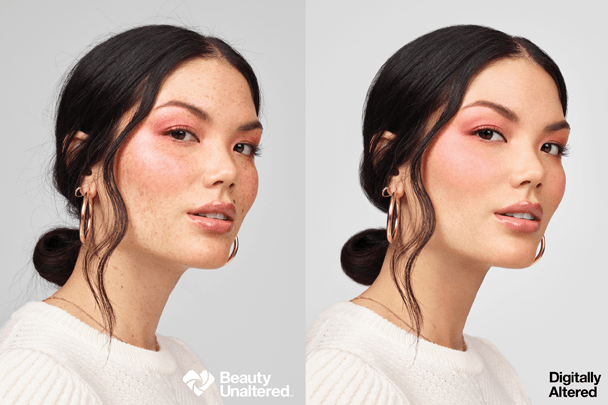 The "CVS Beauty Mark" is the most ambitious attempt to set new standards I've seen to date. In 2018, CVS announced CVS Beauty Mark. In an attempt to redefine post-production standards, CVS is labeling all their images—digitally altered and otherwise. Unaltered images get a watermark, the "CVS Beauty Mark," to highlight that they haven't been "materially altered." CVS says, "materially altered is defined as changing or enhancing a person's shape, size, proportion, skin or eye color, wrinkles or any other individual characteristics." Altered images get slapped with a bold black tag saying "Digitally Altered."