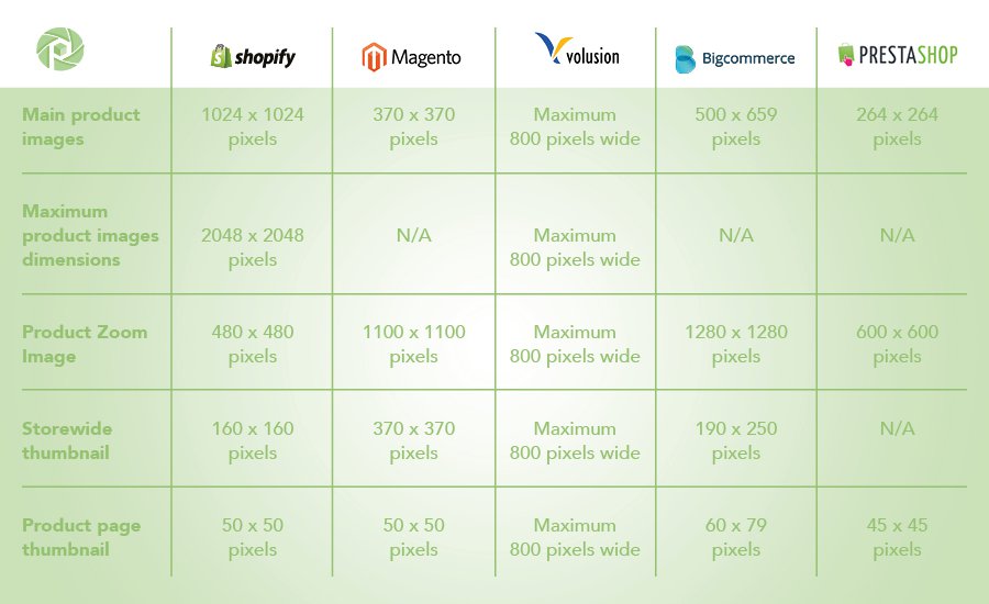 Take a look at the following comparison chart to for recommendations on image sizing from well-known platforms Shopify, Magento, Volusion BigCommerce and PrestaShop.