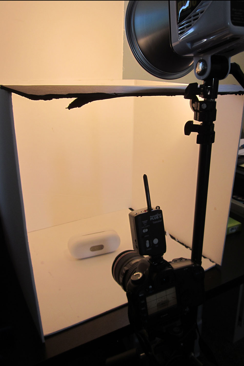 By this point, you have created a white box around the product. You may have seen or heard of using a “product box” or “product tent” to create similar imagery. Product photography lightboxes and tents do work, but rather than bouncing light off of foam core to illuminate the product as we have done, photographers using boxes or tents must utilize several lights in the whole setup. Then they have to spend a great deal more time adjusting the distances between lights and the product, tweaking lights’ power settings, and experimenting with light modifiers—all to achieve what we have accomplished with just one light and some foam board.
