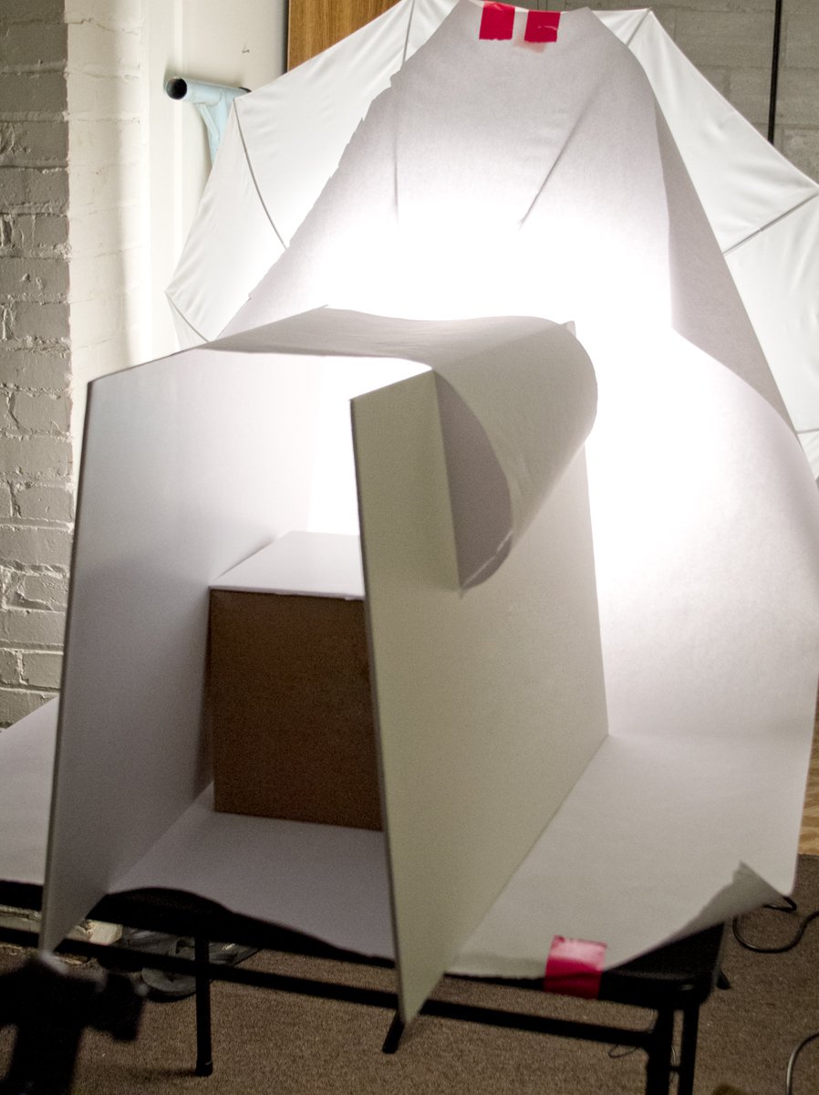 Next, you need to diffuse, or soften, the light source with an umbrella and/or several layers of rolled paper or thin white fabric. Position the white paper or fabric between the product and the light and supplement that by placing white foam board under the product and to both sides, as shown above.