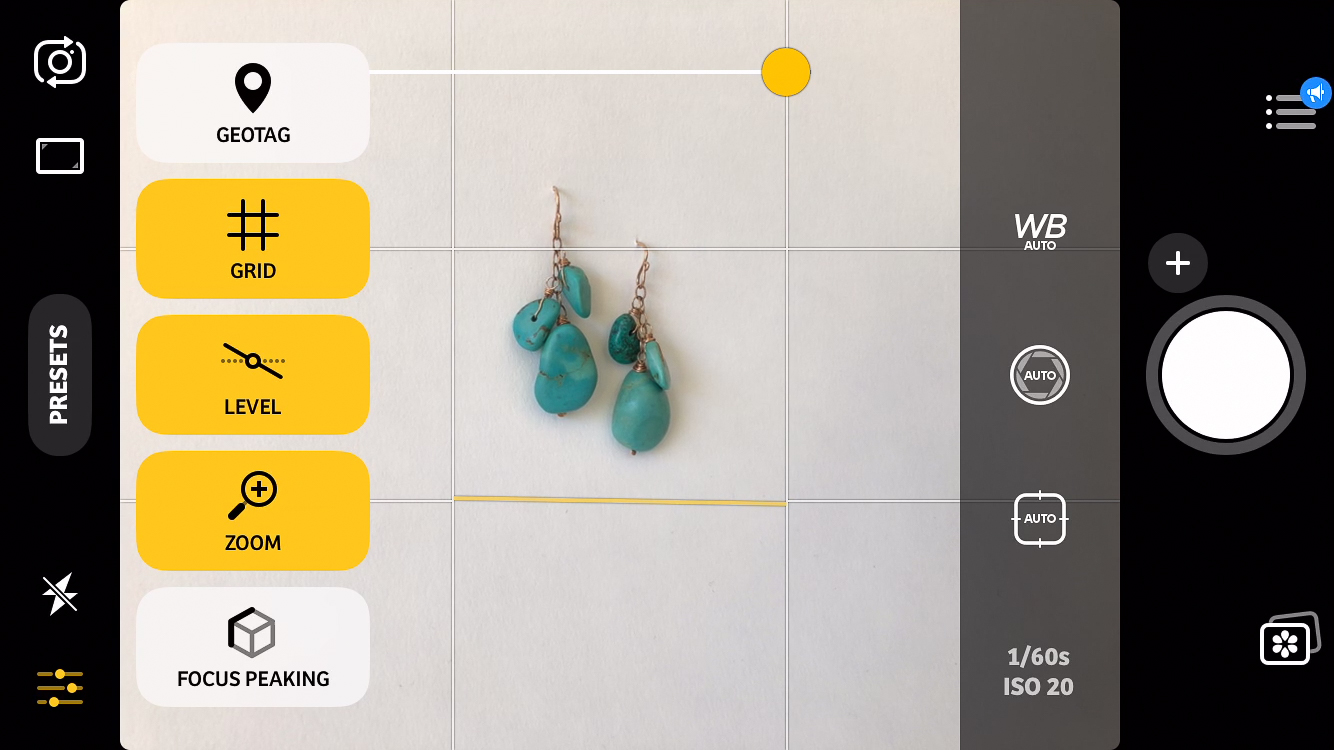 - Exposure – the camera can choose the exposure for you, but make sure to “tell it” where to look (i.e. don’t expose for the white background or your product will be too dark). Drag exposure button to the area you want to expose for and let the app adjust accordingly. This option is easiest if you’re not familiar with DSLR camera controls.