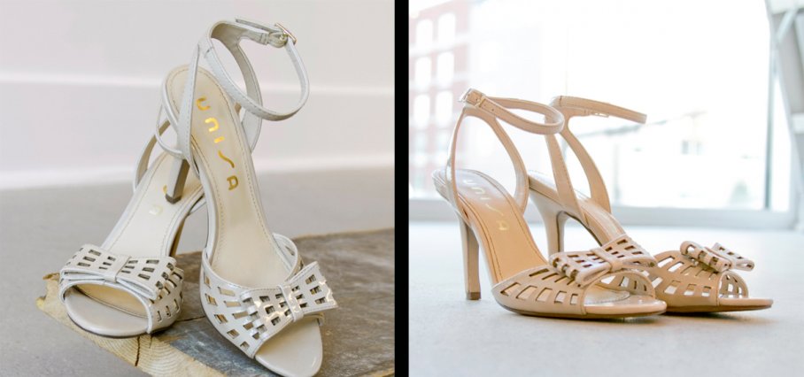 Nothing is more unflattering than a limp, lifeless pair of shoes. The image of the heels on the left, provides very little accurate information to the customer to help inform their purchase decision and it certainly doesn’t make the shoes seem appealing. Instead of a creamy white, the shoes appear to have a yellow tint, and although the shoes have been arranged to show different angles of view, customers will have difficulty imagining how the shoes actually look when worn.