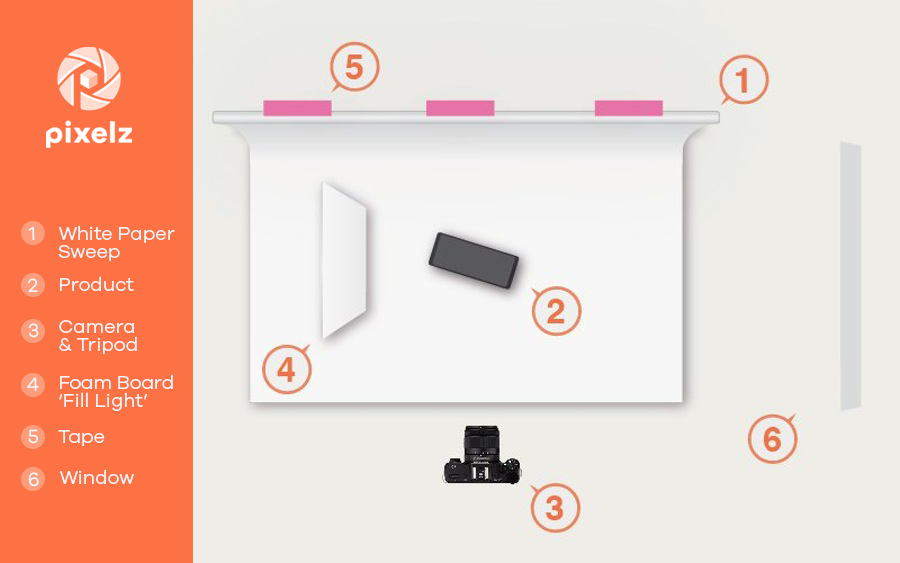 It is important to get a long roll of white paper, because you need to create a seamless white "sweep" (a curved seamless background behind the product), in order to reduce the amount of post-production work your images will require after shooting. There's a reason e-commerce photography is synonymous with white background photography.